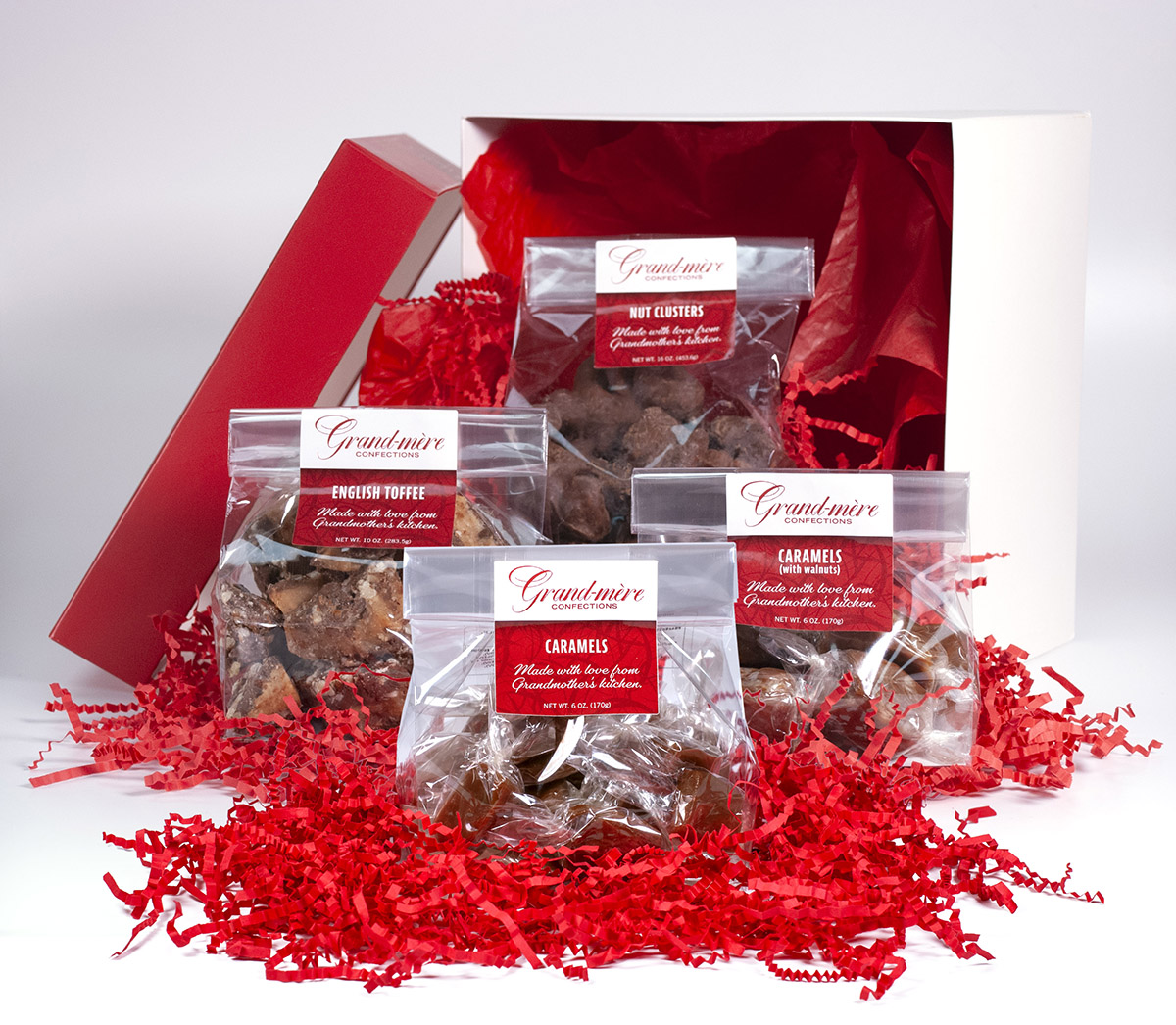 You get our rich English Toffee, crunchy Nut Clusters, creamy Caramels with Walnuts and creamy Caramels (no nuts) all ready to be sampled and shared with friends (the sharing part is up to you of course!)